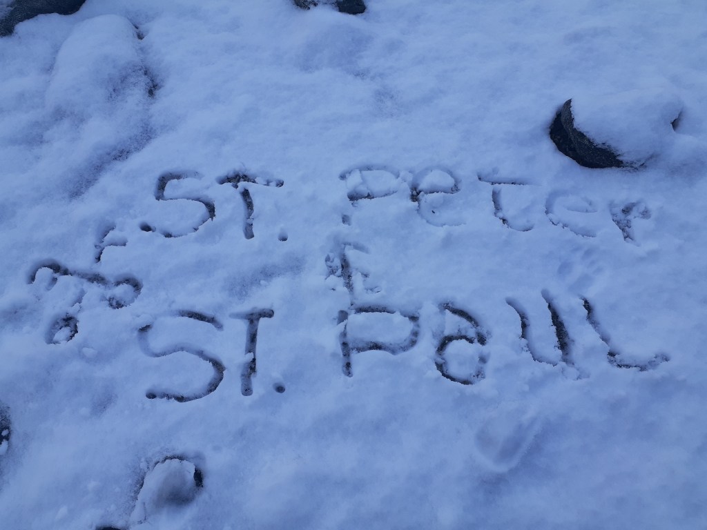 We just reopened our Church last weekend. We were desperate about coming back and now we are gathering together in our Church. Now our challenge is to understand the message of the Lord which becomes harder and harder with the pandemic in with fake news inundating media and the internet. Last year and the new year seems to be lost for many who are not aware of God’s presence. We are glad to be together to help each other so we can understand what is the Lord’s will individually and as a community. I am ready to keep journeying with you even in icy roads. The following pictures I took the a few days ago when it was raining and snowing. I was thinking about you, my beloved community. I have to confess that I wrote this words on the snow and with bare finger it hurts. I was praying as I was writing after a beautiful snowy morning